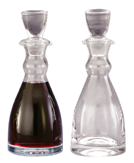 The paired glass cruets present a graceful harmony of form, each vessel shaped with a rounded body, slender neck, and arched handle that speaks to timeless liturgical elegance. One holds a deep, ruby‑toned liquid that glows richly through the clear glass, while its companion stands in luminous clarity, poised for water or sacramental use. Together they create a refined tableau of contrast and balance, elevating even the simplest elements with quiet reverence.