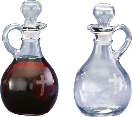 The paired glass cruets stand with quiet dignity, each formed with a rounded base, graceful handle, and a finely cut stopper crowned with a cross. One vessel holds a deep, wine‑rich hue that glows warmly within the clear glass, while the other remains luminous and transparent, emphasizing the purity of its purpose. Together they present a harmonious tableau of contrast and devotion, perfectly suited to the solemn beauty of liturgical service.