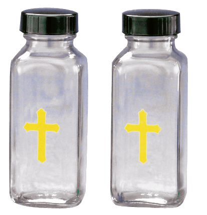 The paired glass bottles stand in clean, modern symmetry, their straight walls and black caps offering a crisp, utilitarian profile. Each vessel bears a bright yellow cross on its front panel, a simple yet striking emblem that lends a clear devotional identity to the otherwise minimalist design. Empty and luminous, they present a purposeful clarity well suited to orderly preparation and reverent liturgical use.