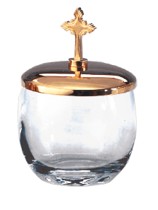 The clear glass vessel presents a smooth, rounded form that reflects light with quiet, ceremonial clarity. Its gold‑toned lid rises to a finely shaped cross, adding a dignified devotional accent that crowns the piece with understated reverence. Together, the luminous glass and warm metal create an elegant harmony well suited to the solemn beauty of liturgical use.