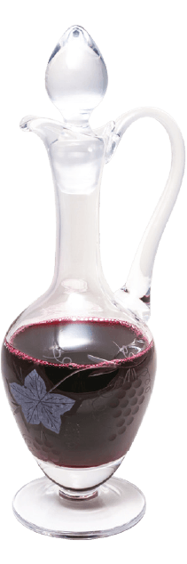 The clear crystal flagon rises with graceful stature, its elongated neck and rounded body adorned by a delicate leaf motif that catches the light in soft, shimmering patterns. Filled with a deep, wine‑rich hue, the vessel’s luminous clarity enhances the warmth and depth of the sacred offering it holds. Balanced by its elegant handle and crowned with a poised stopper, it presents a harmonious blend of artistry, devotion, and liturgical refinement.