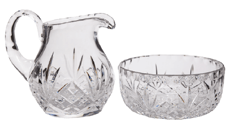 The clear cut‑glass pitcher and matching bowl shimmer with diamond‑and‑fan motifs that scatter the light in brilliant, prismatic reflections. Their balanced forms—one rising in a graceful pour, the other resting in poised simplicity—create a harmonious pairing suited to moments of quiet ceremonial dignity. Together, their luminous surfaces and timeless craftsmanship offer a refined accent of clarity and reverence within the liturgical setting.