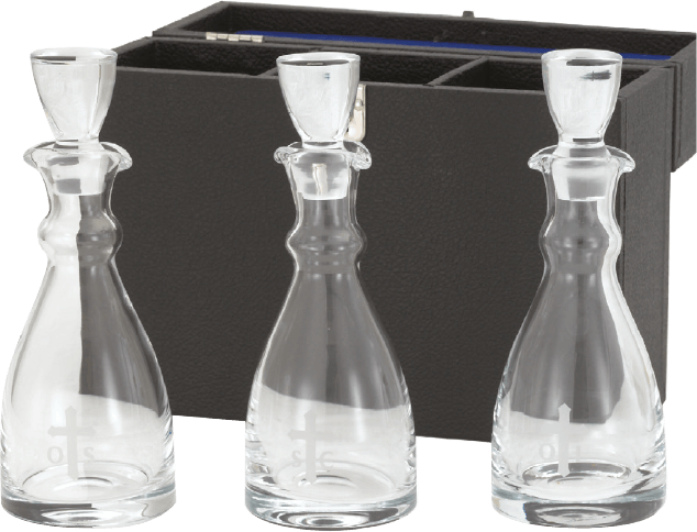 These radiant glass vessels are filled with richly colored oils and adorned with an elegant engraved monogram, reflecting the sacred purpose of their contents. Each bottle is crowned with a rounded stopper and shaped with graceful symmetry, creating a harmonious balance of beauty and function. Their luminous presence and refined craftsmanship make them a dignified addition to any sacristy, honoring the solemn rites of anointing.