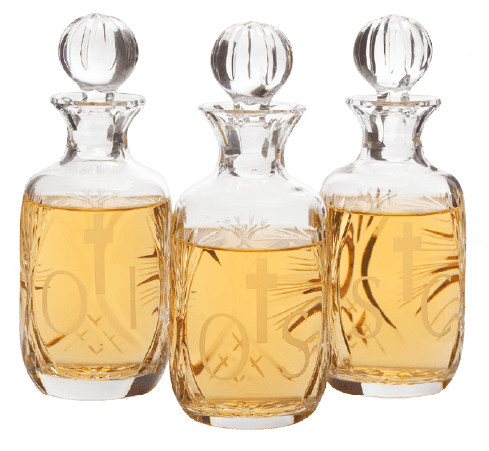 These exquisite lead‑crystal vessels shimmer with exceptional clarity, their finely cut surfaces catching and refracting light with dignified brilliance. Each bottle is crowned with a rounded stopper and adorned with delicate engraved motifs, elevating the sacred oils they are crafted to hold. Their luminous weight, refined detailing, and heirloom‑quality craftsmanship make them a distinguished addition to any sacristy, honoring the solemn beauty of anointing rites.