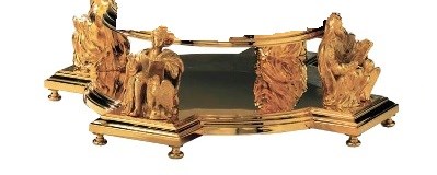 This distinguished tabor is crafted in a warm gold‑tone finish, its sculpted surfaces richly adorned with the traditional symbols of the Four Evangelists, each rendered with classical depth and dignity. The polished platform rises with quiet authority, offering a noble foundation for the monstrance it is designed to support. With its harmonious proportions and finely detailed iconography, this pedestal brings a profound sense of sacred continuity to Eucharistic exposition.