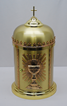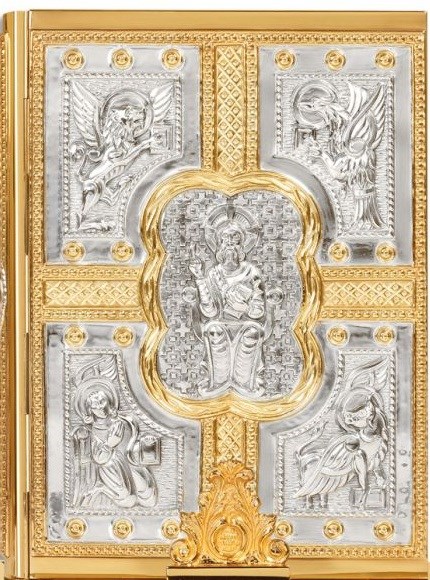 Gospel Book Cover #3000 features a deeply tooled design of Christ in Majesty set against a richly detailed Cross and the Symbols of the Four Evangelists. It can also be ordered with custom made clasps at additional cost. (Illustration shows two-tone.)