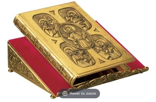 This distinguished Missal Stand features a sculpted triangular form with richly embossed panels that lend it both visual depth and ceremonial presence. A cushioned upper surface provides a dignified resting place for the sacred text, while the surrounding metalwork showcases intricate motifs that echo traditional liturgical artistry. Blending stability, elegance, and devotional refinement, it serves as a noble support for the Gospel during proclamation or display.