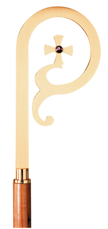 Crozier with 5' walnut staff.  72"H overall.  Wooden staff does not break down to fit into K61 case.  Available 24k gold plate, stainless steel or satin brass. Stones can be added for an additional cost and are available in different colors. Please call or email for more information.